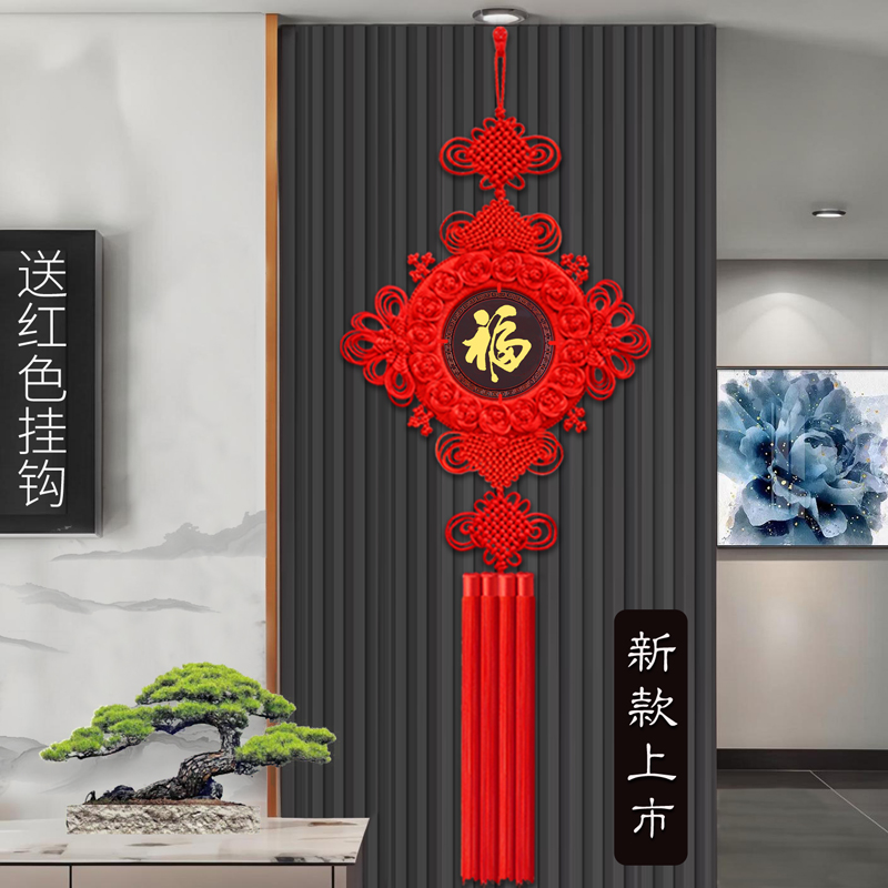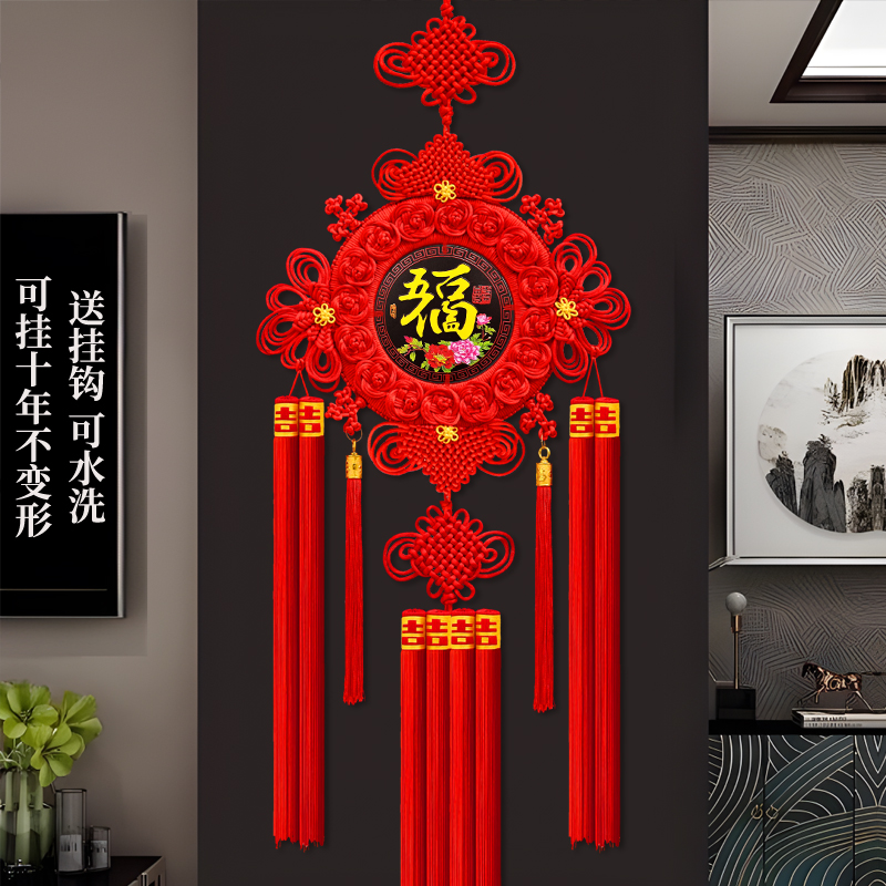 New Chinese knot pendant, large "Fu" character, peach wood, for living room, entryway, TV wall, sofa wall, and front door.